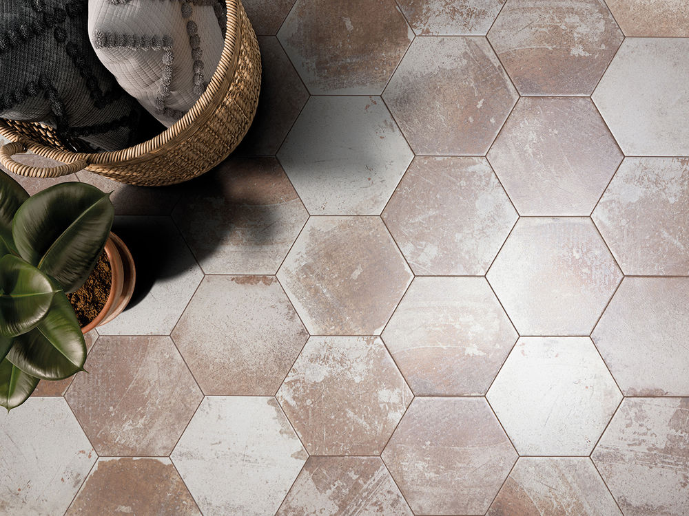 Decocer también ha diseñado el pavimento cerámico Geode en el formato 17,5x20 cm (7"x8") . Este pavimento hexagonal está inspirado en las piedras naturales de tonos marrones y beiges, lo que confiere una calidez especial a los espacios. Son piezas todas diferentes con barridos de variadas tonalidades, lo que permite romper la monotonía.