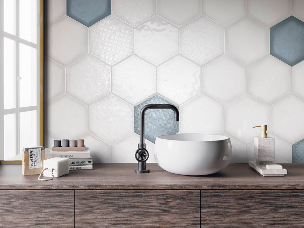 Hexágonos a la carta Las piezas hexagonales son uno de los formatos diferenciales de la firma cerámica de diseño de autor. En este caso, la colección Argos Sky se presenta en el tamaño 17,5x20 cm (7"x8").