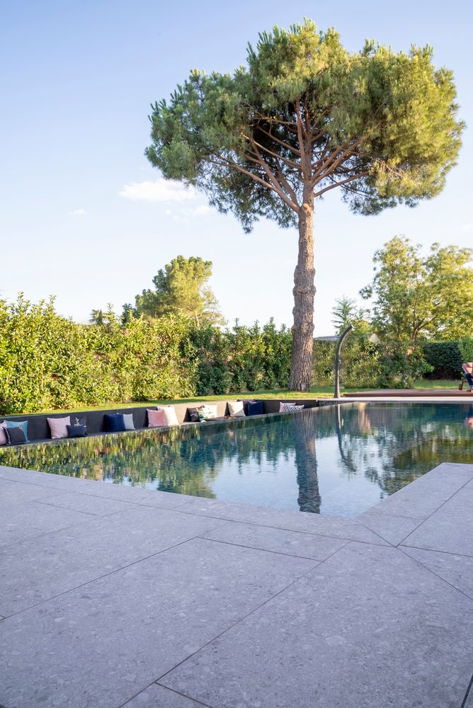 Las propuestas de piscinas de APE Grupo se caracterizan porque se pueden realizar propuestas de diseño globales y coherentes utilizando el mismo material para revestir el interior de la piscina, la corona, la zona social de alrededor, las terrazas, los jardines e incluso llegar al interior de la vivienda.