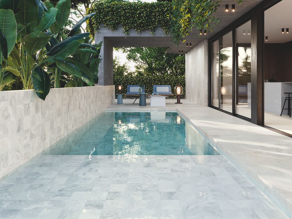 Los colores cambian en función de la incidencia del sol Y es que el color que percibimos de una piscina varía con la incidencia de la luz en el agua, con el momento del día y el movimiento de pequeñas olas. Por ejemplo, los tonos blancos, como el mármol blanco cerámico, consiguen un azul intenso caribeño que le da un aspecto tropical y fresco.