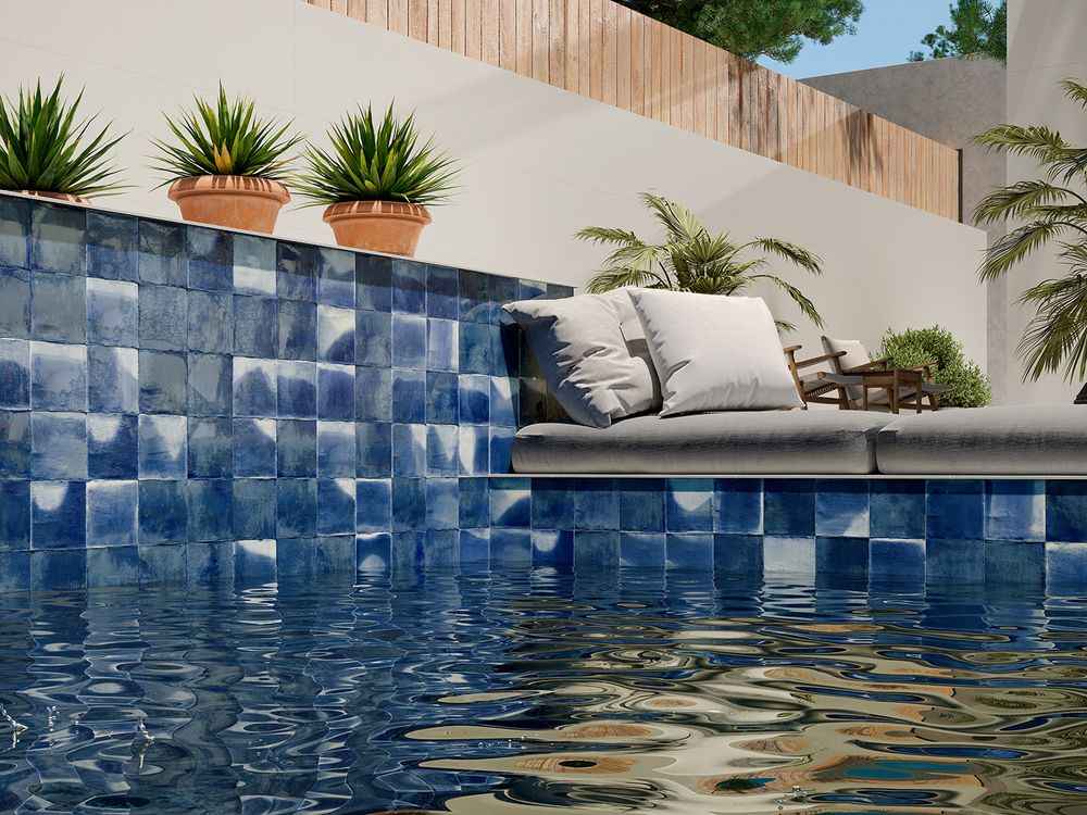 Argenta propone el uso de estas piezas en porcelánico brillo de 15x15 cm para revestir todo el interior de una piscina en un llamativo color azul , creando un efecto intenso que evoca la profundidad del mar con los reflejos de la luz y el agua.