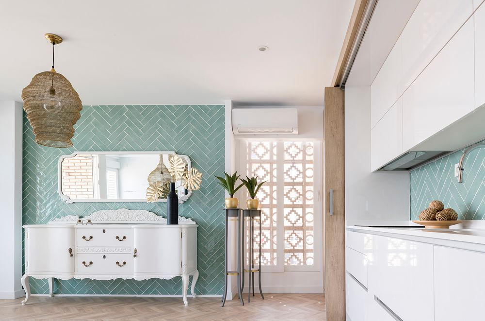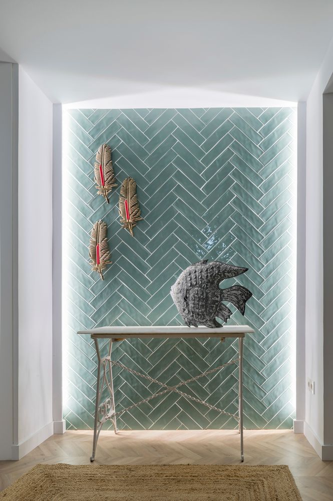 Expresivas piezas de cerámica colocadas en forma de espiga Las piezas de cerámica de la colección Ravello, de la marca Carmen, se repartieron estratégicamente por toda la gran estancia con el fin de recrear juegos de luz y color. "Seleccionamos estas piezas por su brillo especial y tonalidad singular, que bien iluminadas, recuerdan al mar Mediterráneo que rodea la vivienda", apuntan los interioristas.
