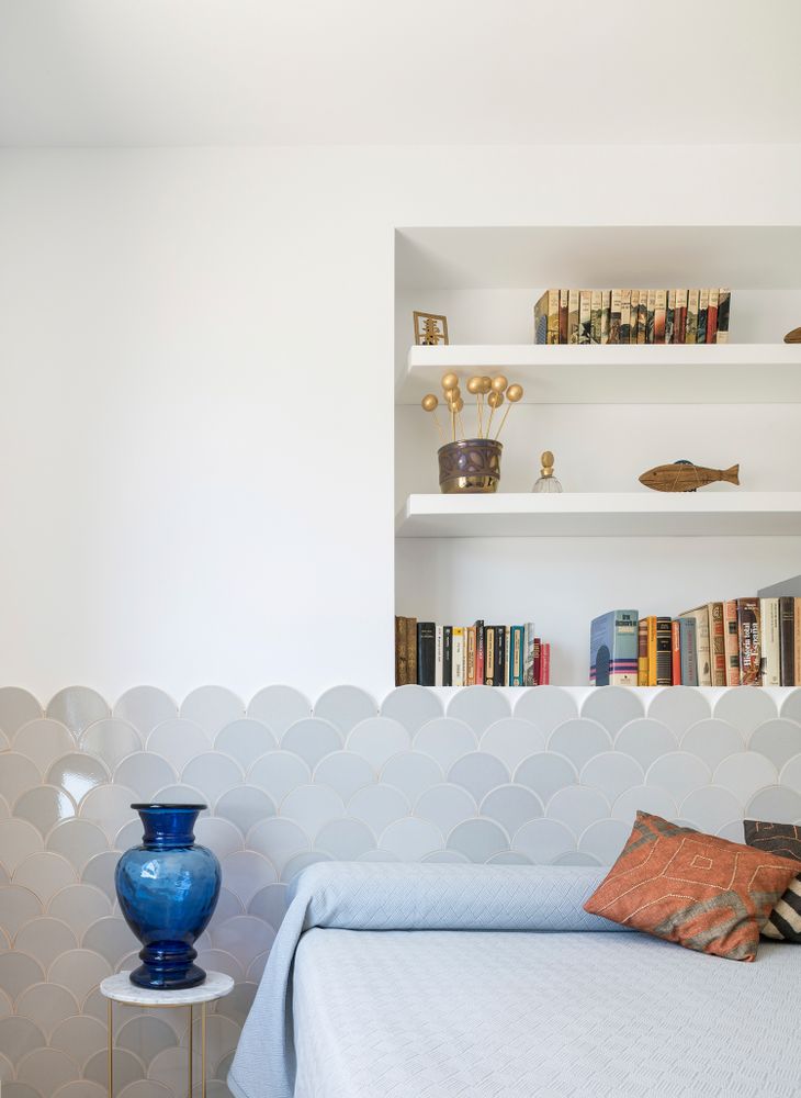 Un cabecero en cerámica con piezas en forma de escama de pez Otro uso innovador con la cerámica de APE fue reproducir los cabeceros de cama de los dormitorios con piezas en forma de escamas de pez , consiguiendo una gran singularidad a través de los juegos geométricos y brillos en las piezas. Estas piezas forman parte de la colección Memories de la marca Carmen, y se fabrican utilizando el tradicional sistema de bicocción, lo que permite obtener degradados y craquelados en su superficie.