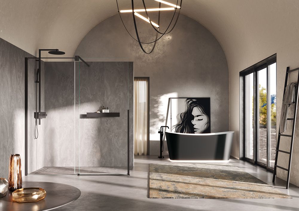 Mampara abierta H-STYLE acabado negro mate Novellini , empresa dedicada a la fabricación de mamparas de baño, bañeras, minipiscinas, cabinas, columnas, platos de ducha y accesorios, con más de cincuenta años en el sector,