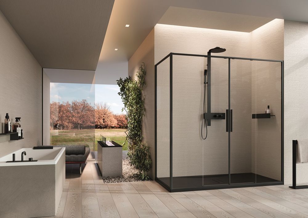 Colección mamparas Riga con perfil acabado negro y blanco de Novellini Esto incluye la introducción de métodos de reciclaje interno y la elección de materiales en la fabricación de sus productos, garantizando una vida útil más larga y facilitando su posterior utilización.