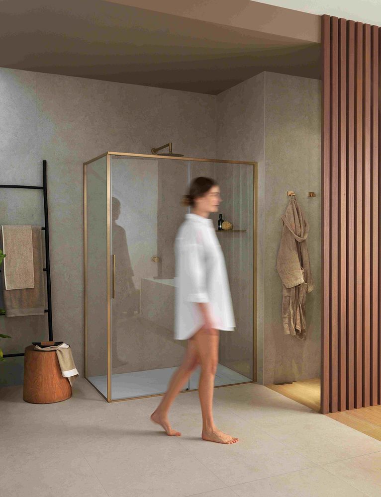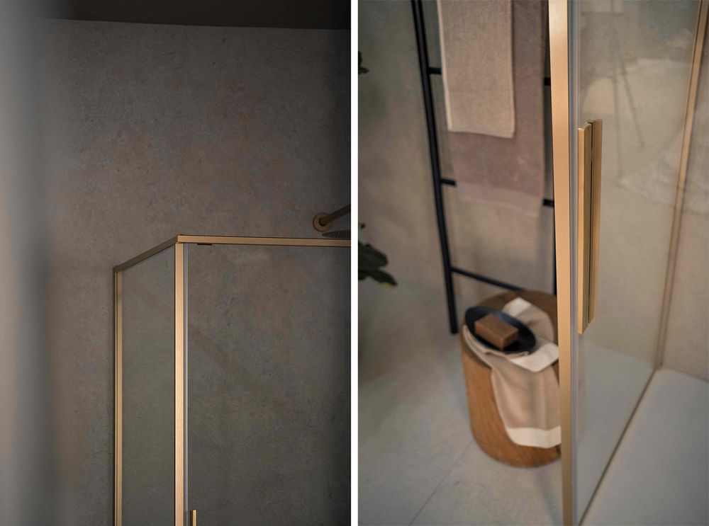 Mampara Riga de Novellini acabado Coloratissimi oro cepillado Novellini , empresa dedicada a la fabricación de mamparas de baño, bañeras, minipiscinas, cabinas, columnas, platos de ducha y accesorios, con más de cincuenta años en el sector, ha presentado una de sus