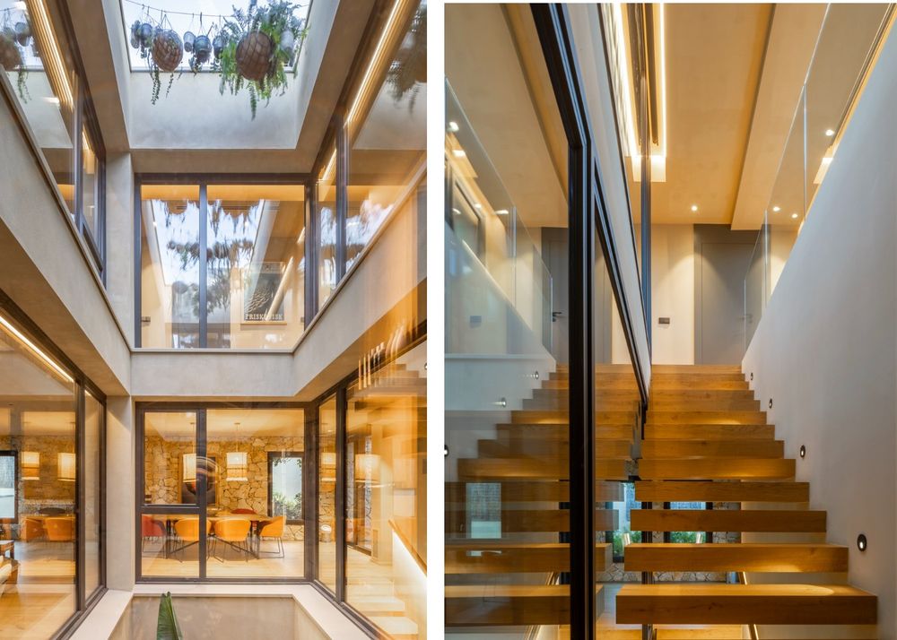 Patio central y escalera suspendida El patio no solo ordena la circulación, sino que también cumple una función climática, al facilitar la ventilación cruzada y permitir la entrada de luz natural a los distintos niveles. Gracias a su transparencia, se establece una conexión visual constante entre los ambientes, aportando amplitud y cohesión al conjunto.