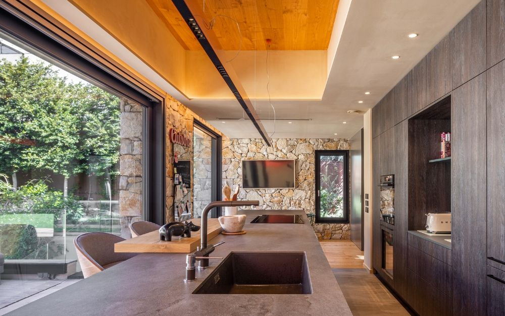 Visión de la cocina desde el jardín La zona de aguas se resuelve con fregadero y grifería de la marca BLANCO, mientras que los frigoríficos integrados de LIEBHERR aseguran un almacenamiento eficiente sin interferir visualmente.