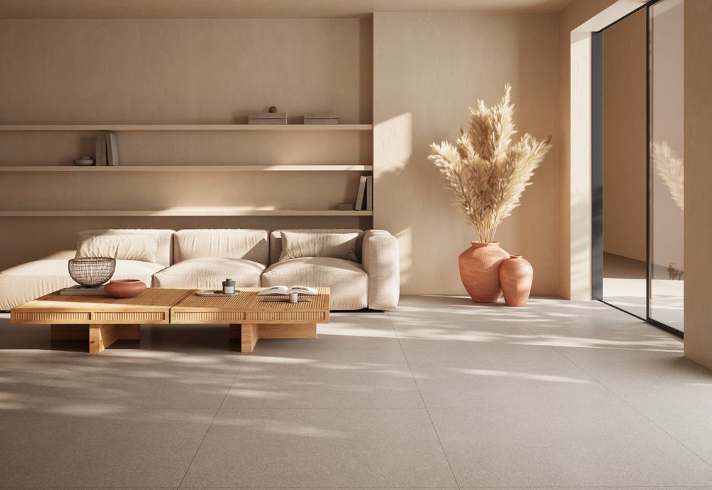 Santelmo Fine: serenidad continua en clave contemporánea La versión más delicada, inspirada en la arena de grano fino, es sinónimo de pureza y fluidez espacial. En interiores donde la calidez serena se convierte en lenguaje —como este salón inundado de luz natural, con mobiliario de líneas orgánicas y una paleta neutra—, Santelmo Fine en acabado Sand aporta continuidad y equilibrio visual. Su superficie mate y homogénea refuerza la sensación de amplitud, actuando como un fondo silencioso que potencia los materiales nobles que lo rodean: madera, tejidos naturales y fibras trenzadas.