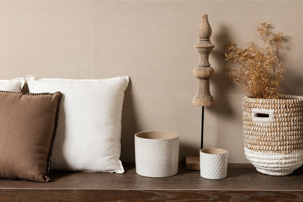 Cada ambiente de la colección revela un alma distinta. El detalle de una pared revestida en tonos arena, junto a fibras naturales, cerámicas artesanas y madera envejecida, transmite una calidez contemporánea que invita a la contemplación. En otras estancias, el juego de relieves y superficies mates crea una elegancia sutil, donde el diseño no grita, sino que acompaña.