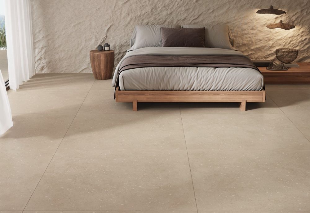 Santelmo Tropic Greige 120x120 cm Santelmo Virgin: textura envolvente para refugios con alma natural La versión más expresiva de la colección encuentra su máxima sensibilidad en Santelmo Virgin, inspirada en la arena de un grano más contundente. En este dormitorio cálido y sereno, el acabado Virgin Gold se extiende como una piel mineral que aporta profundidad y carácter. Su superficie, rica en matices, dialoga con las vetas de la madera y la rugosidad de los muros, generando un entorno táctil, sofisticado y profundamente sensorial.