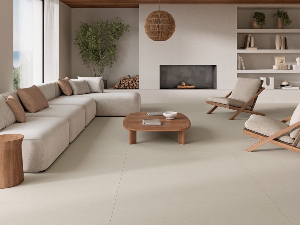 Santelmo Fine Sand 60x120 cm Santelmo Tropic: la fuerza silenciosa de la materia natural Inspirada en la arena de grano medio, la serie Santelmo Tropic aporta una presencia sutilmente estructurada que da carácter a los espacios. En este salón bañado por la luz, donde la madera, el barro y los tejidos naturales se entrelazan, el acabado Tropic actúa como una base serena y envolvente. Su textura ligeramente marcada confiere profundidad visual y una estética mineral cálida.