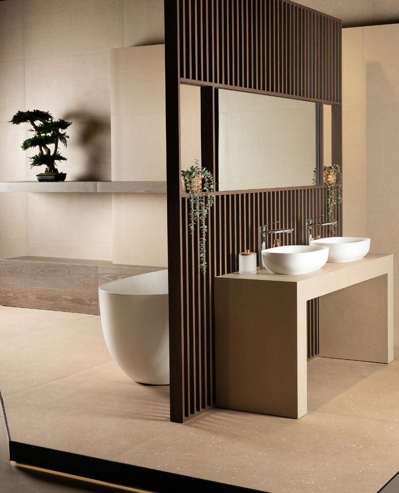 tecnología Artech de Argenta , que se aplica a las piezas de gres porcelánico. Este sistema permite alcanzar un nivel de realismo y profundidad sin precedentes, gracias a la combinación de impresión digital de alta definición con texturas desarrolladas para replicar el grano de la arena en distintas intensidades. El resultado es una cerámica que emociona desde lo más sencillo, con superficies que no solo se ven, sino que se sienten.