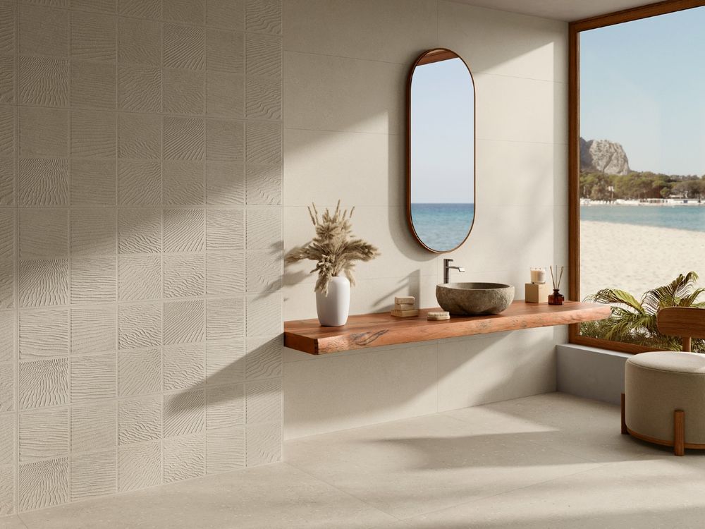 Santelmo Beach Sand 40x120 cm La volumetría de la pieza —finamente labrada en la superficie— transforma la pared en un lienzo sensorial. El diseño combina precisión técnica con emoción visual: un equilibrio entre orden y movimiento que da vida al espacio sin necesidad de ornamentos añadidos. Su tono neutro, cálido y mate refuerza la sensación de calma, mientras que su textura añade dimensión sin saturar.