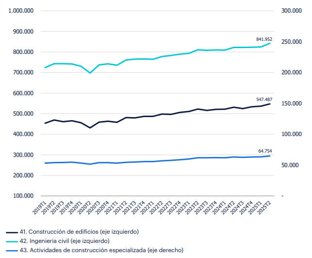 El análisis que se realiza en el sector de la Construcción está compuesto por los segmentos de Construcción de edificios, Ingeniería civil y Actividades de construcción especializada. Precisamente en el segundo trimestre de 2025, el segmento de