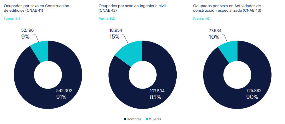 Las cifras reflejan que las mujeres representan solamente un 9,8% del total, una cifra muy por debajo del promedio nacional. La proporción de hombres y mujeres es muy similar en los segmentos de Construcción de edificios y Actividades de construcción especializada, mientras que el empleo femenino tiene un poco más de peso en Ingeniería civil, donde alcanza el 15%.