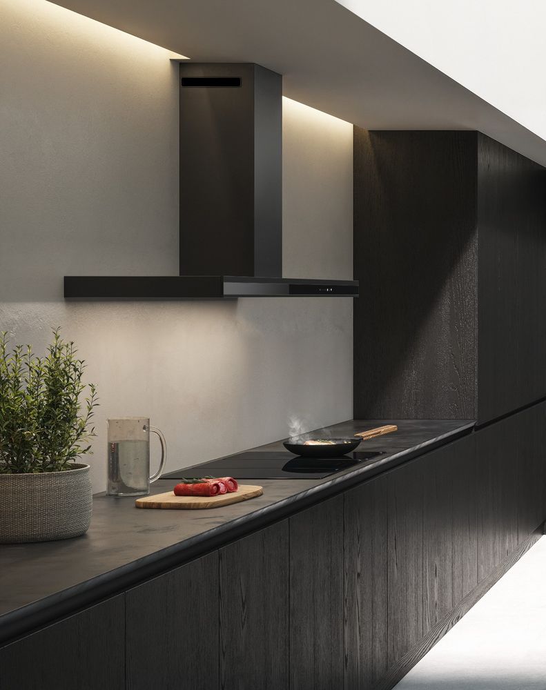 acero inoxidable y negro realzan el efecto imponente de la campana, dando a la cocina un carácter decidido y elegante.