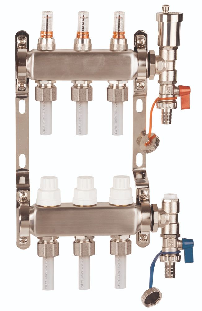 colectores de acero inoxidable de Genebre , dirigidos a la construcción de obra nueva, permiten la alimentación paralela de circuitos de fluidos, ofrecen un gran rendimiento y una regulación óptima y precisa del caudal. (
