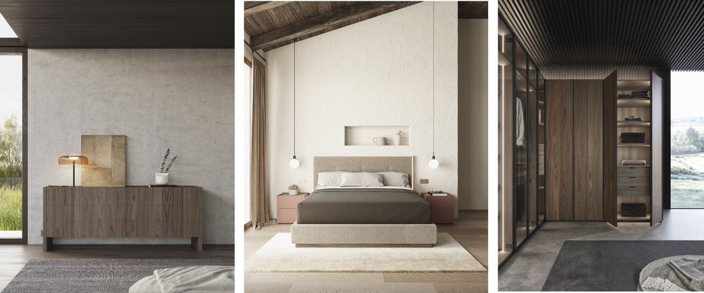 Inspirada en la serenidad y en la belleza de las formas esenciales, la colección incluye una amplia selección de camas, cabezales, armarios, vestidores, módulos auxiliares, cerramientos y complementos, concebidos para crear atmósferas cuidadas, equilibradas y llenas de personalidad. Cada pieza busca ordenar el espacio, aportar confort y acompañar el ritmo íntimo de la noche.