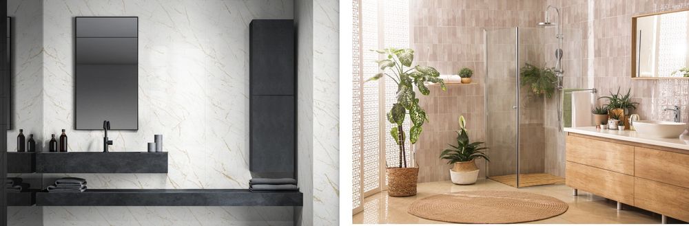 Baños revestidos con Marbre Calacatta Brillant y con Deco Cerámica Vertical de Grosfillex Son ligeros, de fácil montaje, cuentan con un aspecto realista, facilidad de instalación a través de encolado, sin obras, es un material duro y resistente, impermeable al agua y a la grasa, es versátil, duradero y tiene un fácil mantenimiento. Son 100% estancos, no absorbentes, imputrescibles y fáciles de lavar. También son resistentes a los hongos, las bacterias, la humedad y las manchas. Su superficie lisa, no porosa y sin juntas de cemento entre cada losa, ofrece un mejor control de limpieza y una excelente desinfección de las uniones.