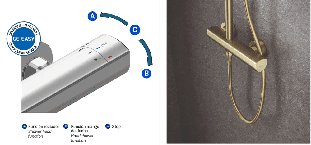 - Cartucho doble función: progresivo (regulación de la temperatura) y con GE-EASY (desde una sola maneta se acciona el rociador y el mango de ducha.