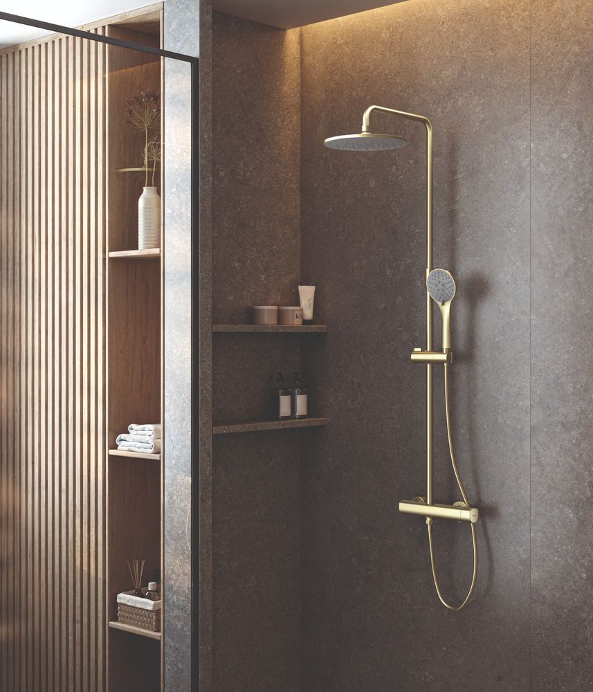 Referencia CM69110 34 51 acabado brushed PVD Gold Genebre , la compañía líder a nivel mundial en válvulas y accesorios para el control de fluidos y grifería de alta calidad, presenta una nueva columna de ducha para complementar su novedosa serie de grifería para baño