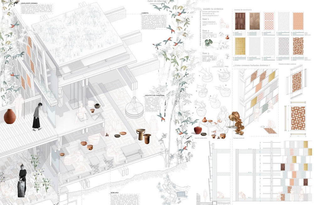 El jurado destaca que el proyecto constituye un auténtico homenaje a la cerámica, en un amplio sentido, entendida en toda su amplitud y vinculada de forma profunda a la tradición local. La propuesta demuestra una comprensión del proceso cerámico, utilizándolo como elemento articulador del espacio y como hilo conductor de un recorrido que recupera y revitaliza los vacíos y ruinas del pueblo de Los Loros, en La Gomera. Se valora especialmente el cuidado estudio de composiciones y patrones, capaces de generar ambientes dinámicos, así como el respeto de la arquitectura tradicional, concatenando talleres de artesanos donde la cerámica es protagonista.