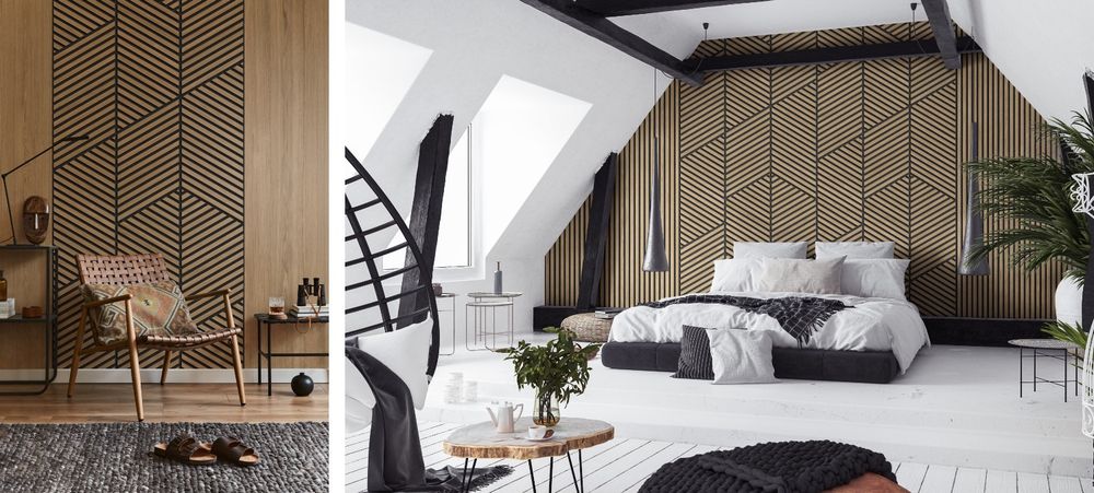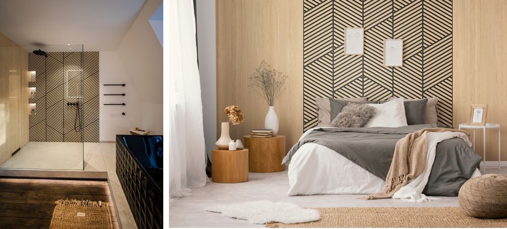 Salón y dormitorio decorados con los nuevos paneles Linio Graphic Light Oak de Grosfillex La gama