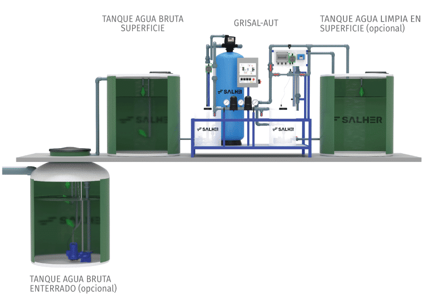 equipo GRISAL-AUT de Salher es una planta compacta de reutilización de aguas grises y aguas residuales depuradas pensada para las aplicaciones no potables, que integra una lámpara UV para la desinfección más segura.