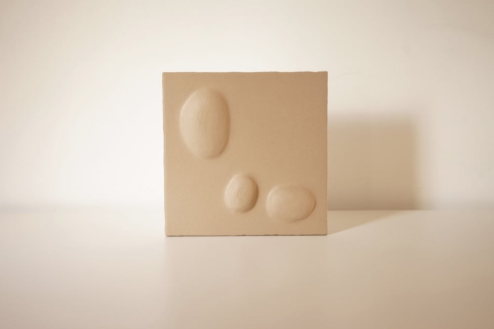 Las piezas, realizadas en arcillas blancas en el color NUDE esmaltado mate, cuyas medidas son 25x25 cm por 10-12 mm de espesor, están pensadas como piezas de arte para ofrecer a arquitectos y interioristas infinidad de posibilidades a la hora de su colocación.