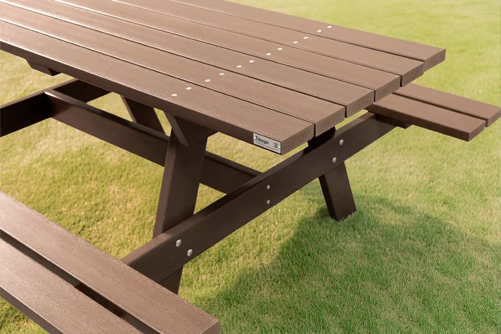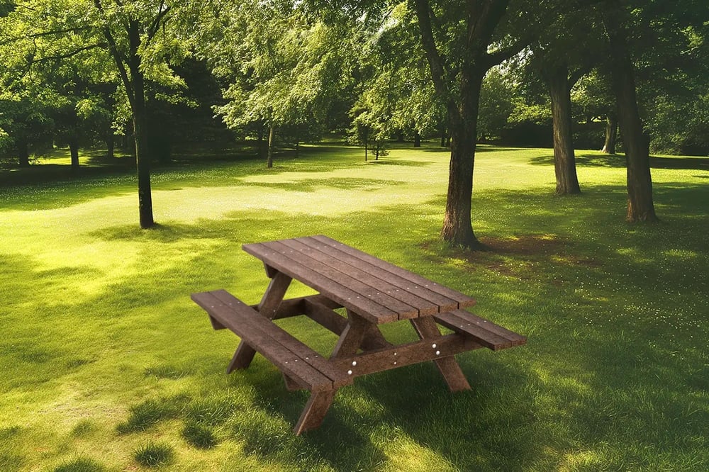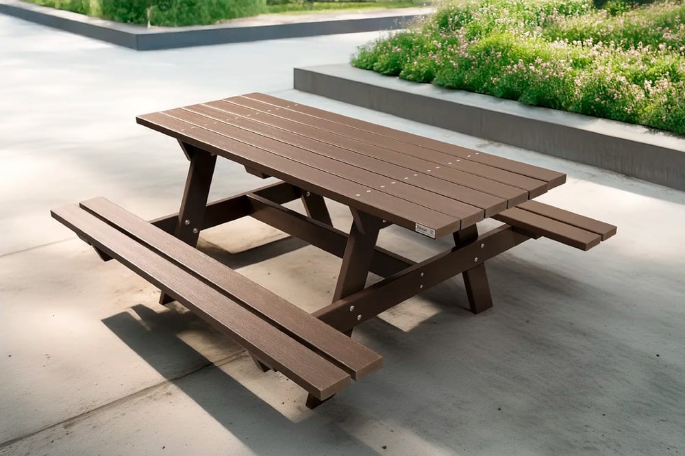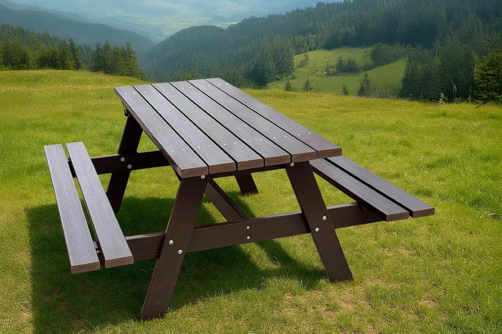 mesas de picnic fabricadas en materiales reciclados.