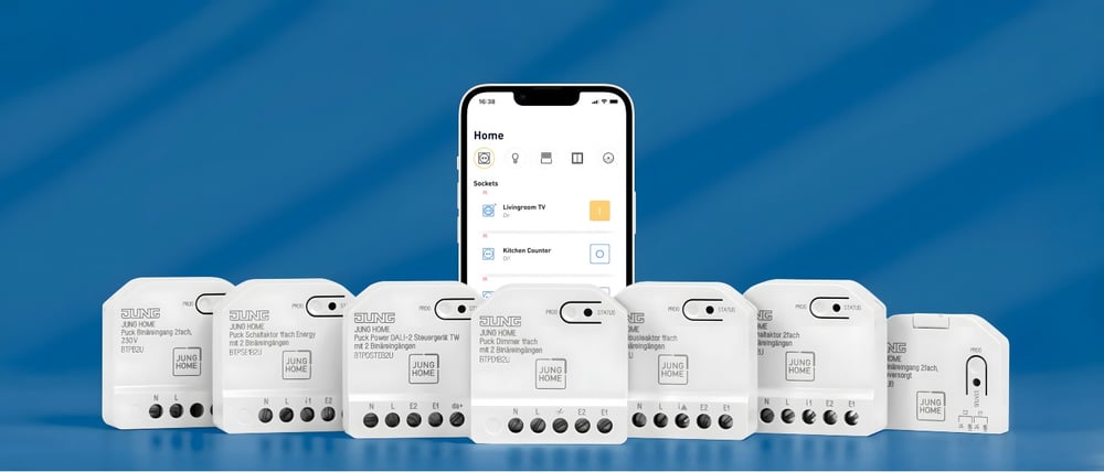 JUNG HOME Pucks . Estos dispositivos permiten dotar de inteligencia a las instalaciones convencionales sin realizar obras en los paramentos. La comunicación se realiza mediante la tecnología inalámbrica Bluetooth Mesh de bajo consumo. Este sistema facilita la actualización de viviendas existentes a los estándares de hogar conectado de forma sencilla. El diseño de estos módulos permite su colocación directa tras los mecanismos ya instalados en cajas de empotrar universales.