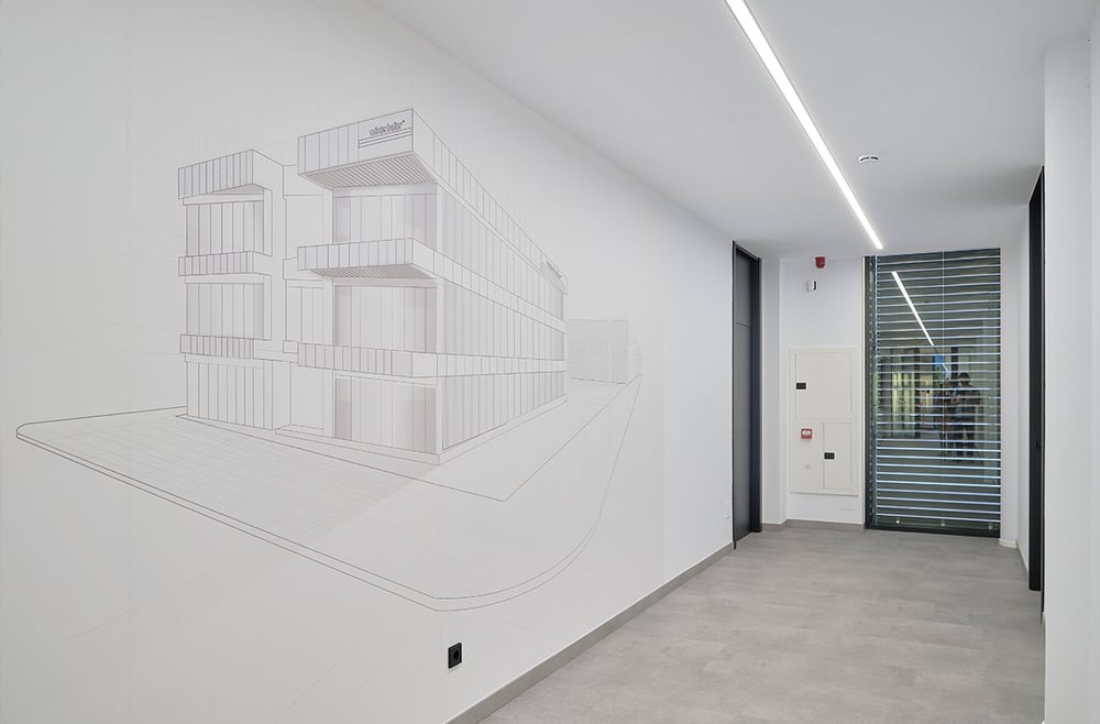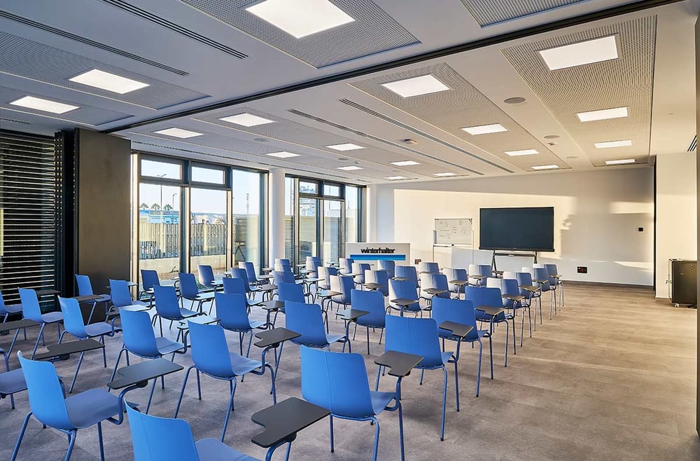 Un edificio diseñado para la innovación y el bienestar El nuevo edificio de Winterhalter se caracteriza por su arquitectura inteligente , su equipamiento de alta tecnología y su apuesta por el diseño centrado en las personas. Las instalaciones incorporan persianas automáticas reguladas por señal satelital, sensores de luz y sistemas de control energéticamente eficientes, que optimizan el consumo y mejoran el confort de los trabajadores.
