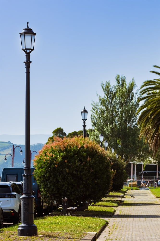 Alineación de luminarias Litoral AC en entorno urbano, combinando diseño clásico y eficiencia energética. Este planteamiento permite garantizar estabilidad fotométrica, uniformidad lumínica y reducción de costes de mantenimiento, alineándose con los objetivos municipales de sostenibilidad y modernización del alumbrado urbano.