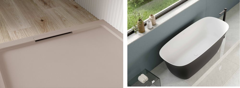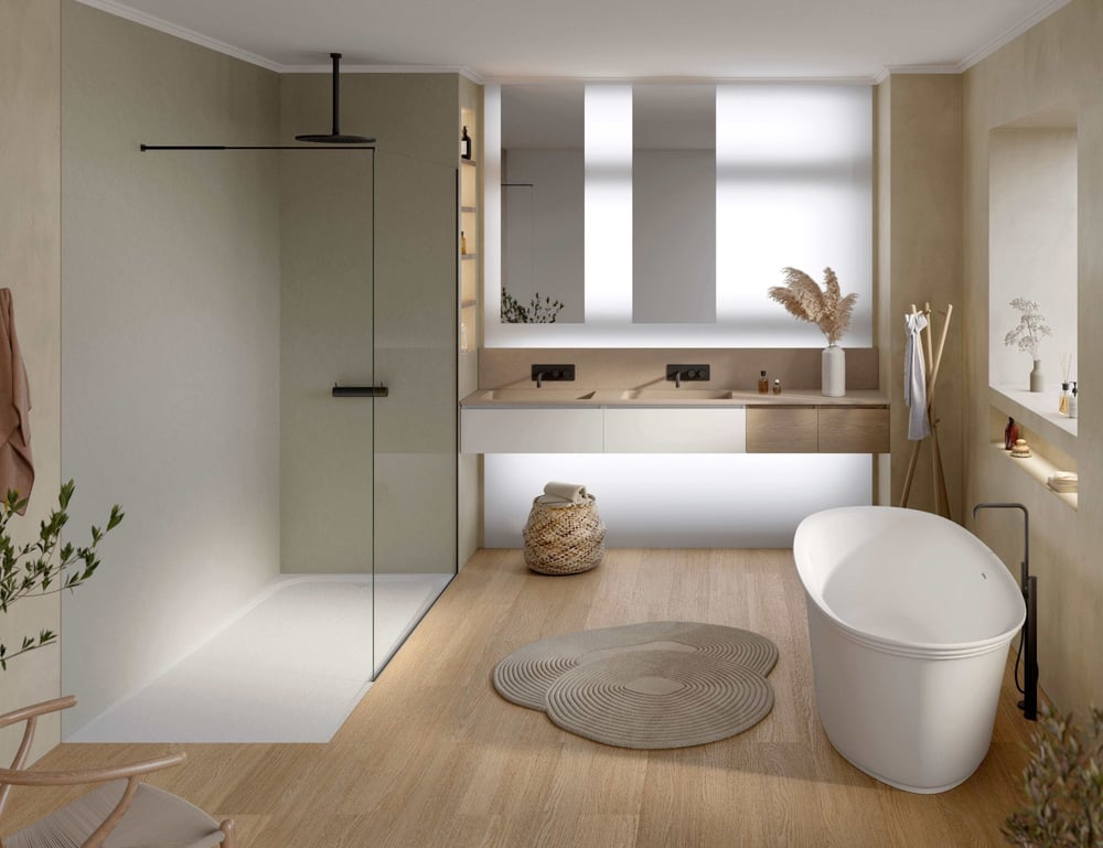 Panel Slim de Acquabella permite revestir tanto la zona de ducha como la de bañera con una solución ligera y continua que aporta carácter al conjunto. Con solo 3 mm de espesor y fabricado en