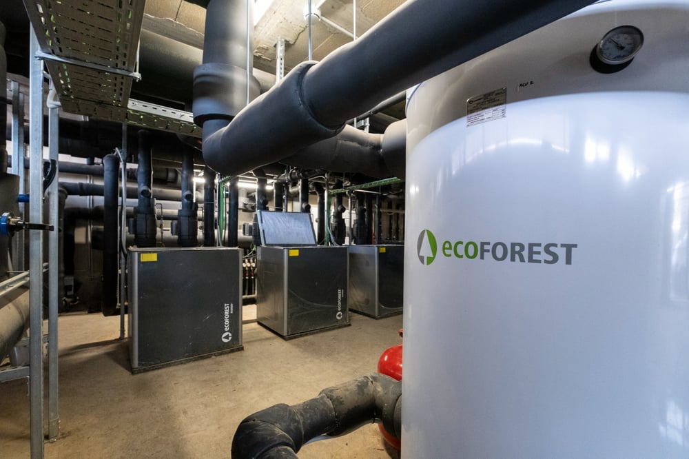 tres bombas de calor agua-agua de alta potencia de Ecoforest ecoGEO+ HP . Estas unidades permiten cubrir simultáneamente calefacción, refrigeración y ACS con un único sistema altamente eficiente, apoyado por la tecnología High Temperature Recovery (HTR).