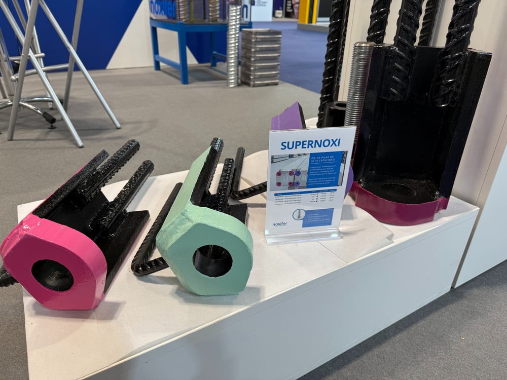 Albert , director técnico de la compañía, presentó una ponencia centrada en las últimas novedades y avances aplicados al prefabricado de hormigón. Entre ellas, destacó el nuevo pie de pilar de alta capacidad SUPERNOXI, para la conexión atornillada de pilar prefabricado de hormigón, con capacidad 52 de hasta 938 kN de carga ELU. Este nuevo elemento, además de su alto rendimiento estructural, llamó especialmente la atención por la nueva línea cromática—turquesa, rosa, lila y magenta—, una propuesta diferencial que no solo aporta identidad visual, sino que mejora su identificación y uso en obra.