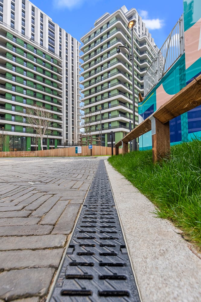 La urbanización Ebury Bridge actualmente cuenta con 100 viviendas de protección oficial nuevas, zonas verdes amplias, espacios de juego y zonas peatonales. En un entorno orientado como este, claramente orientado a la población, un drenaje eficaz es esencial para prevenir la acumulación de agua, mantener la integridad de las infraestructuras y respaldar los objetivos de sostenibilidad a largo plazo de la comunidad.