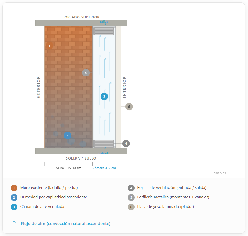 Es la configuración estándar en rehabilitaciones técnicas. Montas una estructura de perfiles metálicos separada del muro unos centímetros. Este hueco crea una cámara de aire técnica (plénum) que ayuda a gestionar la evaporación y debe incluir rejillas de ventilación perimetral para evitar el estancamiento de aire saturado.
