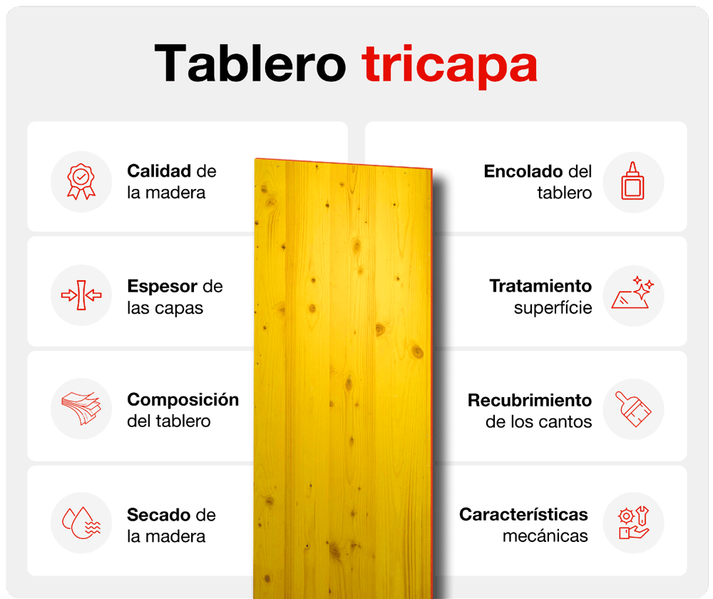 Calidad de la madera La elección de la madera en los tableros tricapa es un factor determinante en su calidad, resistencia mecánica, estabilidad dimensional y número de reutilizaciones.