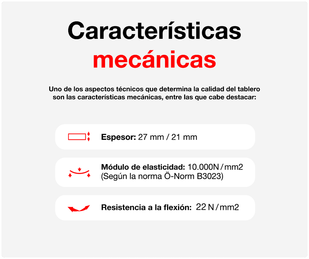 Módulo de elasticidad (rigidez del tablero): Valor medio de 10.000 N/mm² (según norma Ö-Norm B3023). Indica la capacidad del tablero para recuperar su forma original tras una carga. Cuanto mayor es este valor, menor será la deformación en obra.