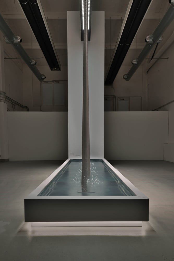 La instalación hace referencia explícita al principio de Geberit SuperTube, un sistema de evacuación optimizado para el flujo que guía las aguas residuales a través de las tuberías en un movimiento en espiral. atelier oï extrae esta lógica funcional de detrás de la pared y la traduce en una experiencia espacial y poética.