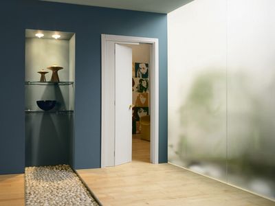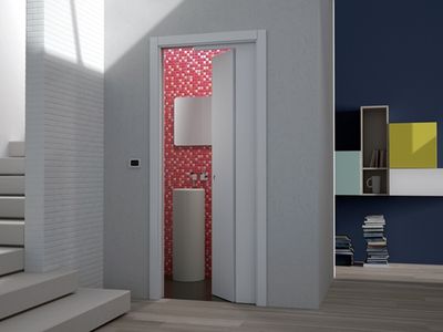 Novanta es el contramarco que aloja una puerta seccional: mientras una parte se esconde dentro del tabique, la otra se abre a batiente, ofreciendo un paso de luz estándar incluso donde las dimensiones son extremadamente reducidas.