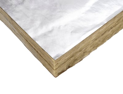 Panel de lana mineral semirrígido, URSA TERRA Barrera Acústica P2292 de URSA. 80x600x1350 mm. 2.5 m²·K/W. No hidrófilo, recubierto en ambas caras con un complejo kraft-aluminio para su uso como barrera acústica en plenums. En panel.