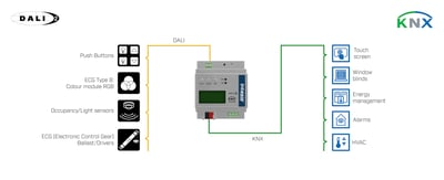Admite pulsadores DALI, sensores de movimiento/luminosidad y entradas genéricas.