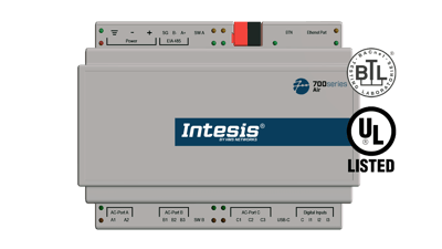 Gateway Serie 700 Air que permite el monitoreo y control independiente de hasta 16 unidades interiores de aire acondicionado Fujitsu, permitiendo elegir entre varios protocolos de comunicación del sistema de control