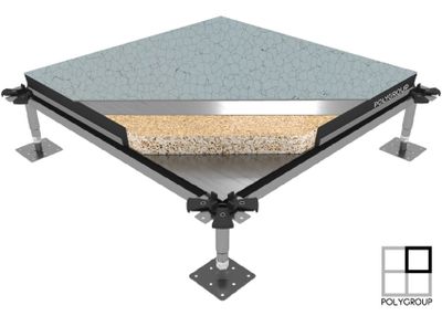 Pavimento elevado y registrable sistema Gamaflor de la firma Polygroup compuesto por baldosas BANK 35/05/05 de medidas 600x600 mm de lado y espesor 35 mm, compuesta de alma de partículas de madera prensada con densidad 720 kg/m3 (+ 10 % según normas internacionales). Soporte inferior de bandeja de acero galvanizado Z-275 de espesor 0,5 mm. Canto perimetral de PVC será de espesor 1,5 mm. La parte superior será de lámina de acero galvanizado Z-275 de espesor 0,5 mm. Con revestimiento superior de Pavimento Vinílico Homogéneo con capacidad electrónica Conductora y una resistencia eléctrica de 1x10e4 a 1x10e6 Ohm tipo POLYGROUP CONDUCTILE SUPER-OR de 2 mm de espesor de gran resistencia a la abrasión y al tráfico intenso, clasificación al desgaste (EN649) en el grupo P, color a elegir. Resistencia de carga repartida será de 33,33 kN/m2. Obtenemos una clasificación al fuego UNE-EN 13501-1:2002 es Blf-S1. Las baldosas irán apoyadas sobre pedestales de acero zincado Gamaflor T-70 compuestos por Cabeza TH y Base VF roscadas entre sí. Cabeza RF de pedestal formada por placa de acero circular de 3 mm de espesor y diámetro de 90 mm, estampada en estrella de 8 lados con 8 taladros para atornillar travesaño y para bloqueo de cápsula conductiva y acústica, soldada linealmente a tubo de 25 mm de diámetro con entalladura en la parte superior y galvanizado en plata; la cabeza del pedestal va roscada a base VF formada por placa de acero cuadrada de 76x76 mm y 3 mm de espesor, soldada lineal a varilla métrica 18 mm, galvanizada en plata con 2 tuercas de acero para bloqueo, la base cuenta con orificios para penetración del adhesivo. El pedestal debe soportar una carga vertical de 48 kN sin deformación y con la clasificación máxima (A1FL) al fuego con certificado bajo ensayo norma UNE-EN 13501-1:2002. La altura final de suelo elevado será de 80 a 900 mm de solera base a superficie de uso de la baldosa. Para el arriostramiento se utilizará un perfil de acero galvanizado en sección tubular cerrada tipo travesaño RF-525 de medidas 25x41 mm y de espesor 1,5 m, con acabado EPDM para absorción acústica del impacto, el cual irá atornillado a la cabeza del pedestal. El sistema debe obtener los valores acústicos sin tener en cuenta el revestimiento según norma UNE EN ISO 10140 y 10848 de Rw>55 dB, Lnw<62 dB, Dnfw>43 dB y Lnfw<67 dB. El conjunto del sistema Gamaflor BANK 35/05/05 será clasificado mediante UNE-EN 12825:2002 clase 6A21 y máximo nivel de escuadratura clase 1. El sistema deberá contar con ficha de reciclado para la contribución del sello LEED del edificio, así como acreditación de la compañía de estar dentro del proceso de sostenibilidad tipo US Green Building Council.