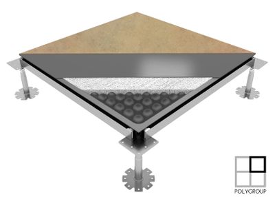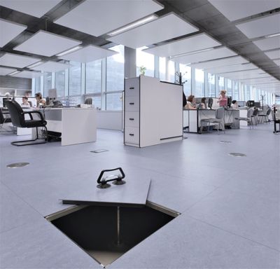 Pavimento elevado y registrable, sistema Gamaflor Full Steel de Polygroup. Acabado PVC Autolider - Autoportante. 51,70 € / m2(1,050 m2 x 51,70 €/m2 = 54,28 €)
