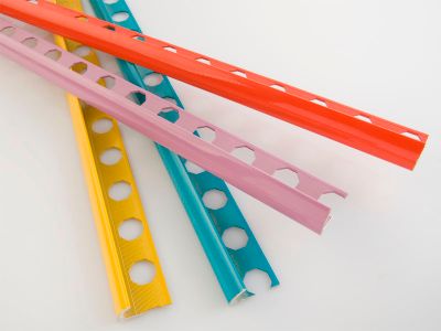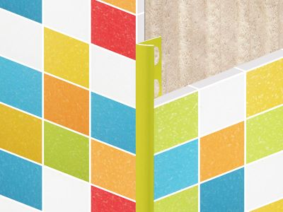 Perfil cantonera redondeado Novocanto® Sensaciones, fabricado en aluminio lacado amarillo alegría nº 107 de 12mmx2500mm, que se emplea como cantonera para proteger y decorar esquinas de paredes revestidas con baldosas cerámicas, aportando la resistencia y ligereza del aluminio. Se coloca fácilmente en el ángulo formado por el revestimiento.