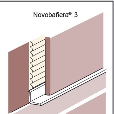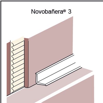 Perfil para evitar esquinas interiores en bañeras o similares Novobañera® 3 de Emac®. Fabricada en co-extrusión de PVC color blanco Nº 01. Perfil de 1,50 m. de longitud, caravista a: 14 mm. y remates de estanqueidad flexibles para evitar filtraciones y humedades en la junta de alicatado, para su instalacióndurante el embaldosado o una vez finalizado el alicatado, colocado según se indica en la ficha técnica del fabricante.